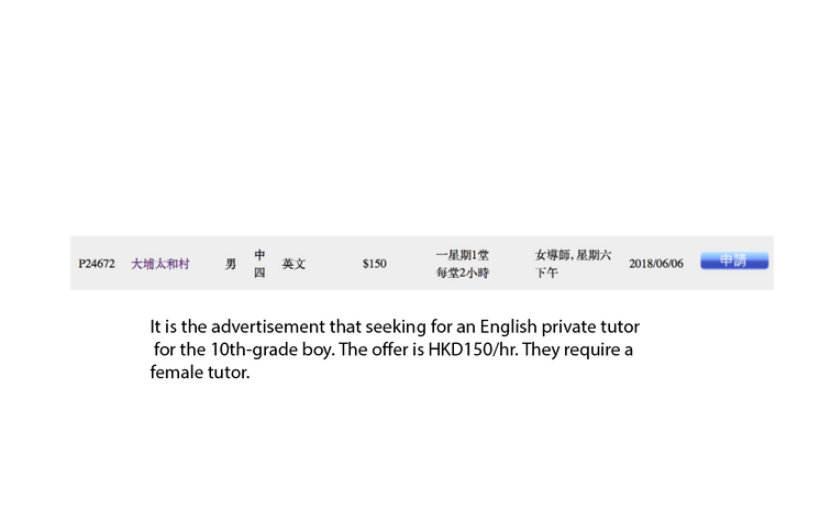 2. it is the advertisement that seeking an English private tutor who is a degree holder for the 9th-grade girl. The offer is HKD350/hr.