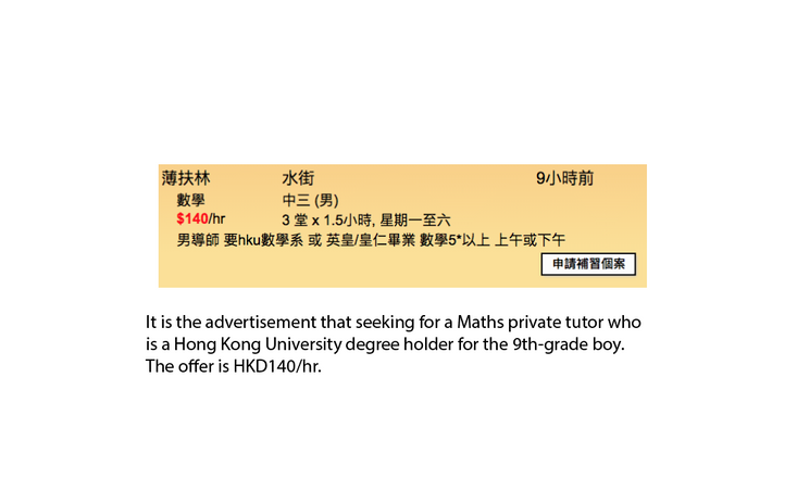 5. it is the advertisement that seeking a Maths private tutor who is a Hong Kong University degree holder for the 9th-grade boy. The offer is HKD140/hr. Also, it requires to hire a male tutor.